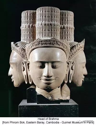 根据佛像前额上的第三只眼睛和盘发的式样来判断,这是印度的湿婆神,他在高棉的圣像艺术中从公元800年到1200年间一直占据着最高位。头像所使用的材料是一种带细纹理和略带绿色的砂石。湿婆的眼神直视并严厉,但略带微笑,尤其是嘴角的两撇精致的小胡子往上翘起,缓解了严肃的神情。作品传递了这具令人生畏的大神的威严和捉摸不定,他的形象以人形或林伽(Lingam,风格化的男性生殖器)形在高棉神庙中一直被供奉着。这个雕像是一个法国殖民教团在19世纪末从吴哥(Angkor)带回法国的,但它的来历并不清楚。