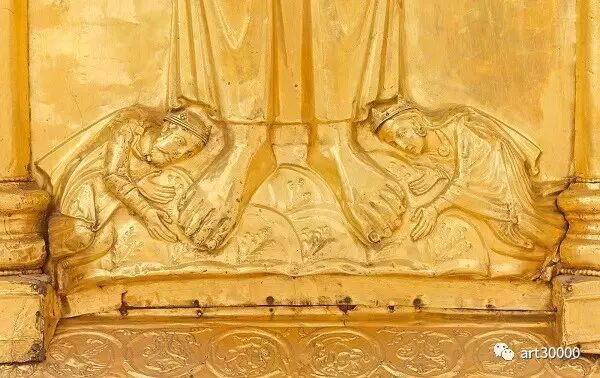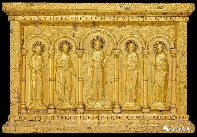 中世纪的许多祭坛正面都是用金属制作的,不过能保存到今天的极少。这个巴塞尔大教堂(译者注:Basel Cathedral,瑞士巴塞尔大教堂原来是天主教的主教座堂,今天属于新教归正会,兴建于1019-1500年,为罗曼式和哥特式风格。罗曼式建筑毁于1356年巴塞尔地震,后重建)的祭坛前部装饰是帝国委托项目的一个杰出例子。它应该成于公元1016年到1019年间,是罗马皇帝圣海因里希二世(译者注: Heinrich II der Heilige,生卒972年到1024年,萨克森王朝的最后一位东法兰克国王(1002年—1024年在位)和罗马帝国皇帝(1014年加冕)公元1002年到1024年在位)和妻子库尼贡德(Kunigunde)向巴塞尔大教堂为其祝圣仪式而奉献的,在作品中我们可以看到他们二人的小雕像匍匐在正中耶稣的脚下。耶稣的身边是天使长拉斐尔(Raphael)、加百列(Gabriel)、米迦勒(Michael)和西方修道院之父圣本笃(St Benedict)。