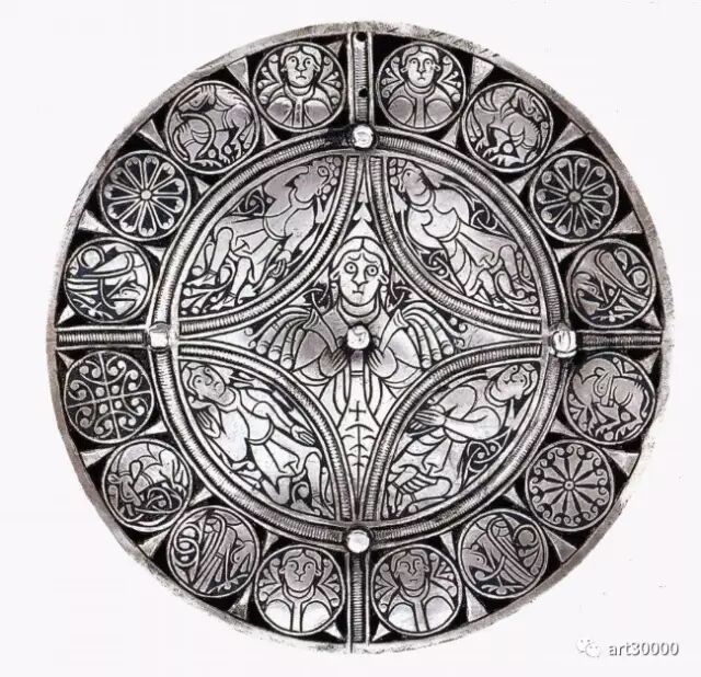 中世纪早期黄金稀缺,所以大部分的金属器皿采用白银制作。碟式胸针在当时是一种时尚的装饰品,碟子上的平面让银匠能够有足够空间进行复杂细致的设计,而且上面还常常用乌银镶嵌术来点缀,即用有色金属硫化物融嵌在银蝶上雕刻的槽中(该工艺在此之前2000多年就有了,参见D104的”镶嵌贵金属的匕首“)。