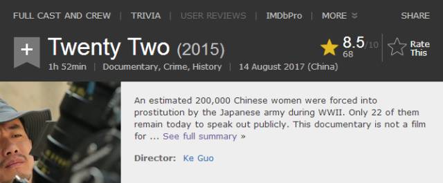《二十二》是中国“慰安妇”题材纪录片第一次在院线展映,片子是3万多人众筹拍的,前期也没有做更多的宣传。