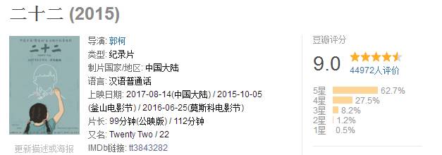 超过4.4万网友在豆瓣上给出了评价,影片获得9分的评分。