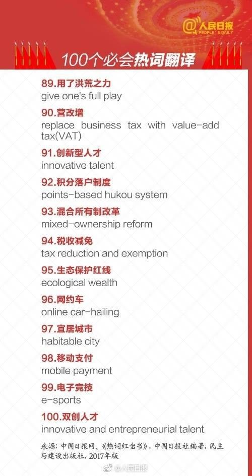 “两个一百年”、工匠精神、国产航母、二维码支付……这些热词,你知道怎么用英文表达吗?如何避免Chinglish,让表达变得更加地道?9图盘点100个必会热词翻译