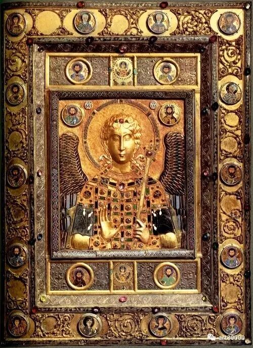 这个活动的大幅圣像是公元975年到1050年间的作品,可能是某个教堂奉献给拜占庭帝国首都君士坦丁堡(今天的伊斯坦布尔)大皇宫中的天使长米迦勒的(译者注:Archangel Michael,是《圣经》中一个天使的名字,天主所指定的伊甸园守护者,也是唯一提到的具有大天使头衔的灵体。米迦勒这个名字的意思是“谁与神相似?”。《圣经》的记载显示,与撒旦的七日战争中,米迦勒奋力维护上帝的统治权,对抗神的仇敌,的确名实相符。《圣经》每次提到他的时候,他都在积极行动与邪灵战斗)。米迦勒和加百利(译者注:Archangel Gabriel,根据亚伯拉罕诸教,加百列是负责為神传递信息的天使长。有时候,他亦被视為死亡天使、火与雷的王子)在拜占庭艺术中常具有帝国般的神圣庄严(参见D637“天使长议会”)。中心画板上是天使长的正面镀银画像,他身穿华丽的长袍,手持权杖并佩戴着Loros(译者注:loros是个希腊词,是一种狭窄的刺绣长巾,往往是用金线刺绣并嵌入大量宝石作为装饰,佩戴方式是用它缠绕身体并用左手握住末端,这是拜占庭帝国正式礼仪场合最重要也是最显赫的穿戴,只有皇帝家庭成员和极少最重要的官员才有资格佩戴)。他的脸部是用凸纹法精心敲打而成的,形成一个突面。米迦勒的上下部及边框内都嵌入了许多半身小圆像,其中包括圣徒、天使长、耶稣和圣母。