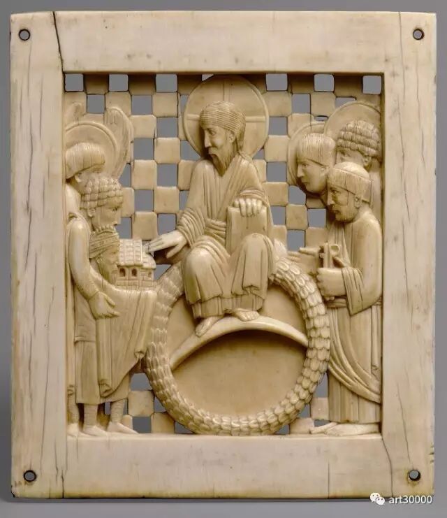 这个象牙小匾是19个幸存的象牙匾之一,它们是一批未知教会仪轨陈设中的一部分。作品中耶稣端坐在类似经典的花圈那样的光轮(Mandorla)之上的王座上,而整个背景就像是一个通透的国际象棋棋盘。