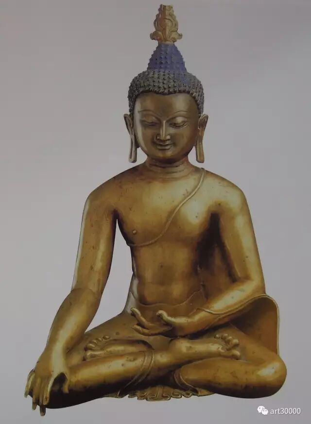 在一个可以溯源到笈多王朝(译者注:Gupta-period,公元320年到550年,是印度人创建的一个大帝国。 笈多王朝统治下的印度,经历了约一百余年的政治统一和社会安定时期。王朝实行中央集权制,由中央政府控制着下面众多的小王公,王公下属的官吏管理着行政。在这个时期内,以经济富庶、人口稠密的恒河流域为中心,经济获得了空前的发展)艺术的印度传统中,佛陀的上身衣衫紧贴其光滑平坦的身体(参见D383的“佛陀说法”)。波罗王朝(译者注:Pala Dynasty,“波罗”在孟加拉语中的意思是“保护”,这是公元8世纪到12世纪时统治印度东北部(今孟加拉国和印度比哈尔邦大部)的一个重要王朝)时期的印度东部艺术的影响可以从雕像的方形脸庞和低垂的眼殓上看出来。对腹部肌肉的描绘足具典型的中世纪克什米尔艺术风格(译者注:Kashmiri Art,指公元最初的300年当中贵霜王朝时期兴起的、犍陀罗风格的艺术与波斯艺术传统相结合、在阿富汗的巴米扬地区最终形成的一种佛教艺术样式。犍陀罗即是今天的阿富汗和巴基斯坦的克什米尔)。虽然印度各文化间的互动从来未曾停止过并在西藏雕塑中有所反映,但其实很难将本作品进行归类。