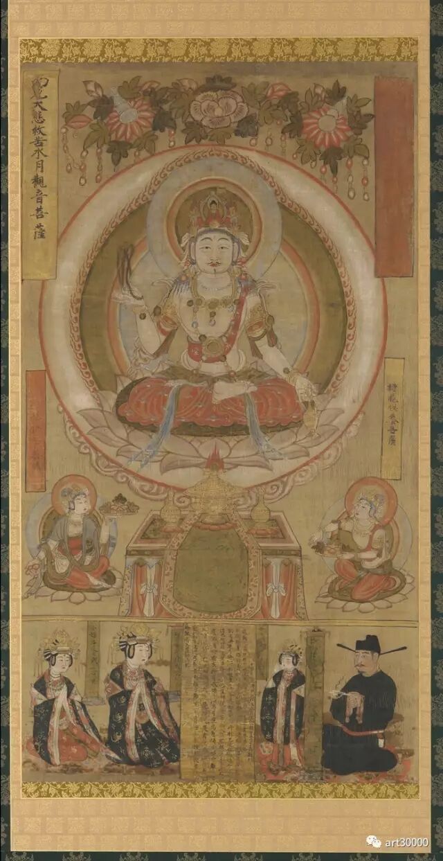 这幅画来自甘肃敦煌,这里是一个进入古代中华帝国的一个必经绿洲客栈地。在公元10世纪时,此地被一个独立的曹家王国占据,在此挂卷的底部即是曹家人的画像并配有文字说明。奥莱尔-斯坦因(译者注:Aurel Stein,著名的英国考古学家、艺术史家、语言学家、地理学家和探险家,原籍匈牙利。曾在1900年到1931年间进行了四次著名的中亚考察,其考察的重点地区是中国的新疆和甘肃)在敦煌发现了大量的佛教珍宝,它们提供了从公元4世纪到14世纪佛教和佛教艺术沿着丝绸之路发展的一段历史,而本作品无疑是这批宝藏中最珍贵者之一。现藏于大英博物馆和法国吉美博物馆的类似作品把这个观音称为“水月观音”(译者注:佛经谓观音菩萨有三十三个不同形象的法身,画作观水中月影状的称水月观音。见《法华经·普门品》。后用以喻人物仪容清丽俊美)。