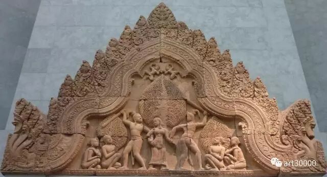 图一这个深浮雕的山墙位于神庙东边第三道大门的门廊之上。雕刻的内容取材于印度史诗《 摩呵婆罗多》(Mahabharata)中关于提络塔玛(Tilottama)的故事。提络塔玛是印度神话中的飞天(译者注:Apsaras,是印度教和佛教神话中的女性云神和水神,美丽、年轻和善舞,常引诱众神和男人),是神为了恢复和平而创造的一个人物,其手段是让两个半神兄弟阿修罗孙陀(Sunda)和乌普孙(Upasunda)为争夺她而相互残杀并自我毁灭,因为他们二人在天上制造了太多麻烦。他二人为争夺提络塔玛的厮杀被戏剧性地表现在这个带裂叶的山墙中。山墙的顶部是叶子,而底部的两头是多头的那伽神怪(译者注:Nāga,是印度神话中的蛇神。这种生物的外表类似巨大的蛇,有一个头或多个头;其形像在婆罗门教、印度教和佛教经典中常有出现)。作品中的人物形象,和比较静态的高棉立体雕塑相比,显得生动而自然,加上富有想象力的构图、优雅的人物形象和葱郁的植物描绘,构成了班蒂丝蕾女王宫艺术风格的特点。本作品是第一个保存完好的高棉叙事艺术的例子,它影响了高棉装饰艺术的后续走向。